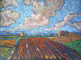 En 1987, au cours d'un hiver de glace et de tensions de tous ordres, éclosent les rayonnantes « Flammes ». Elles succèdent à une période intitulée « Champs », où le fond compartimenté des Baigneuses initiales devient une fin en soi, évoquant, dans son ordonnance rythmique, des champs, des vignes, des labours, comme vus d'avion.